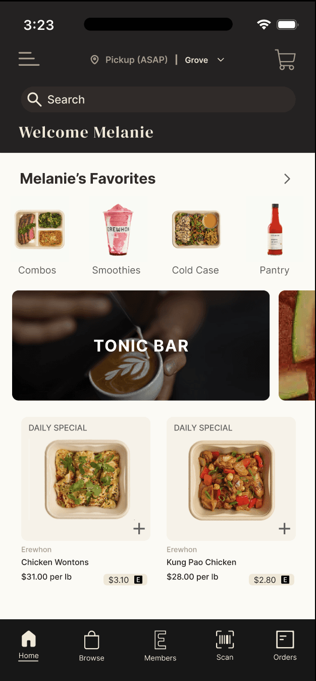 Using 1-3 basic screens, I used Figma to recreate Erewhon's mobile app interface. This bootcamp's final product included designing two kinds of frames, one with vertical scrolling and the other with horizontal, a card that houses variant component properties, at least two prototyped buttons or icons with default and active states, all with correct application of auto layout and named layers.